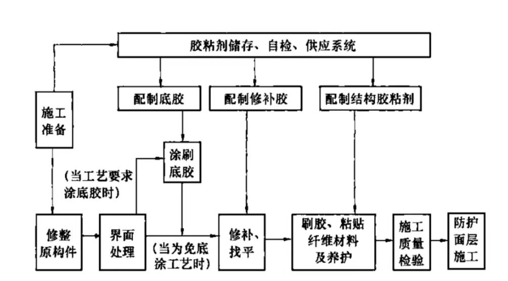 以卡本碳布加固施工為例,工藝流程包含定位放線→砼表面處理→涂刷底層浸漬膠→粘貼碳纖維布→沿單向面多次刮壓→涂刷面層浸漬膠→沿單向面多次刮壓→表面防護。